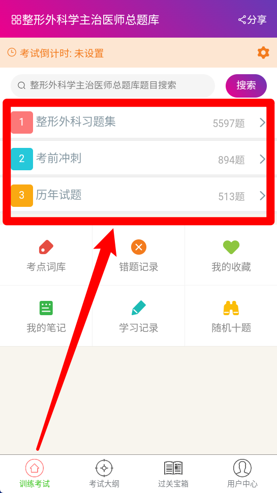 1. 点击“训练考试”选项,就能进入习题集、冲刺题以及历年试题的练习界面。