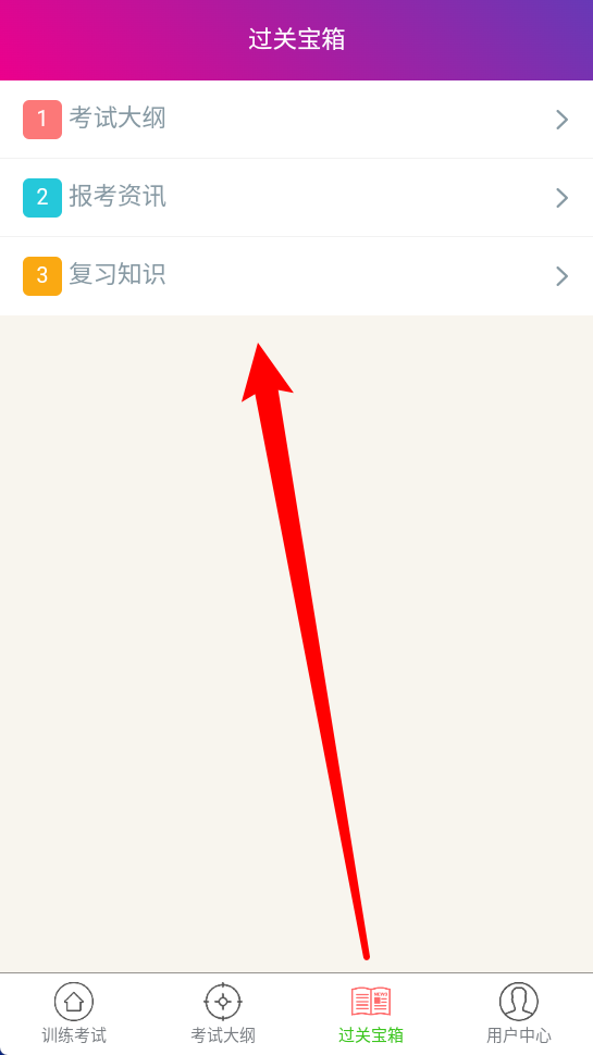 3、点开“过关宝箱”,从中获取考试大纲、报考资讯以及复习知识内容。