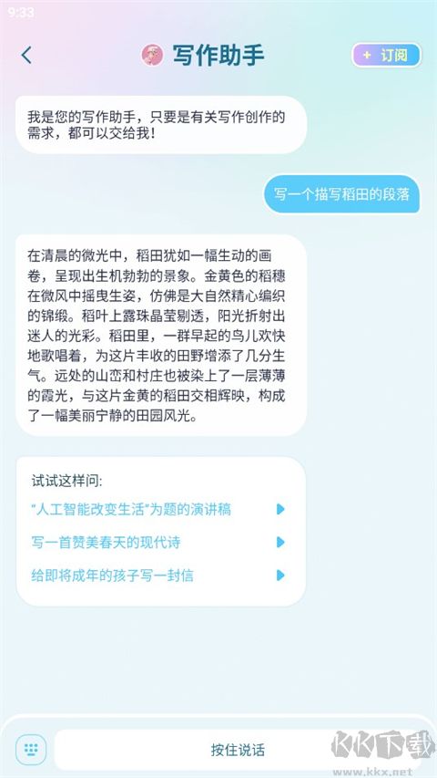 2. 打开私人助理界面,轻点“写作助手”功能,输入主题或者关键词,即可开启文学创作辅助。