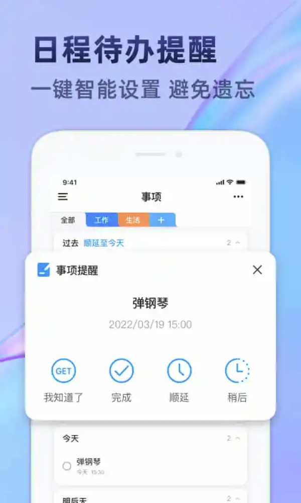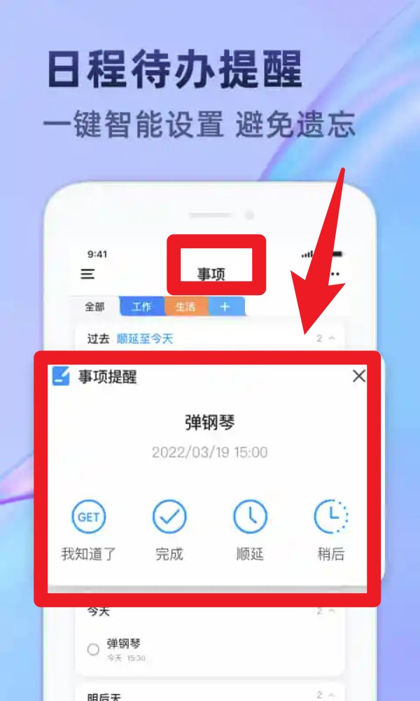 3. 在“事项”页面,你能够新增待办任务,同时还能设定提醒时间。届时,系统会准时弹出通知,并提供“完成、稍后、顺延”等操作选项。
