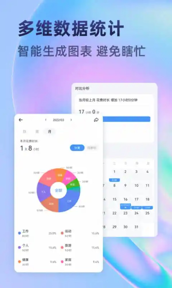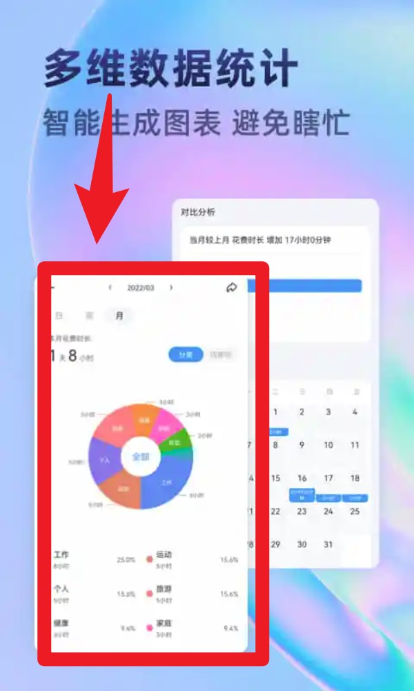 【数据统计】智能生成扇形图、柱状图、饼状图等各类图表,进行多维度数据统计,助你清晰梳理时间花费去向,告别盲目忙碌。