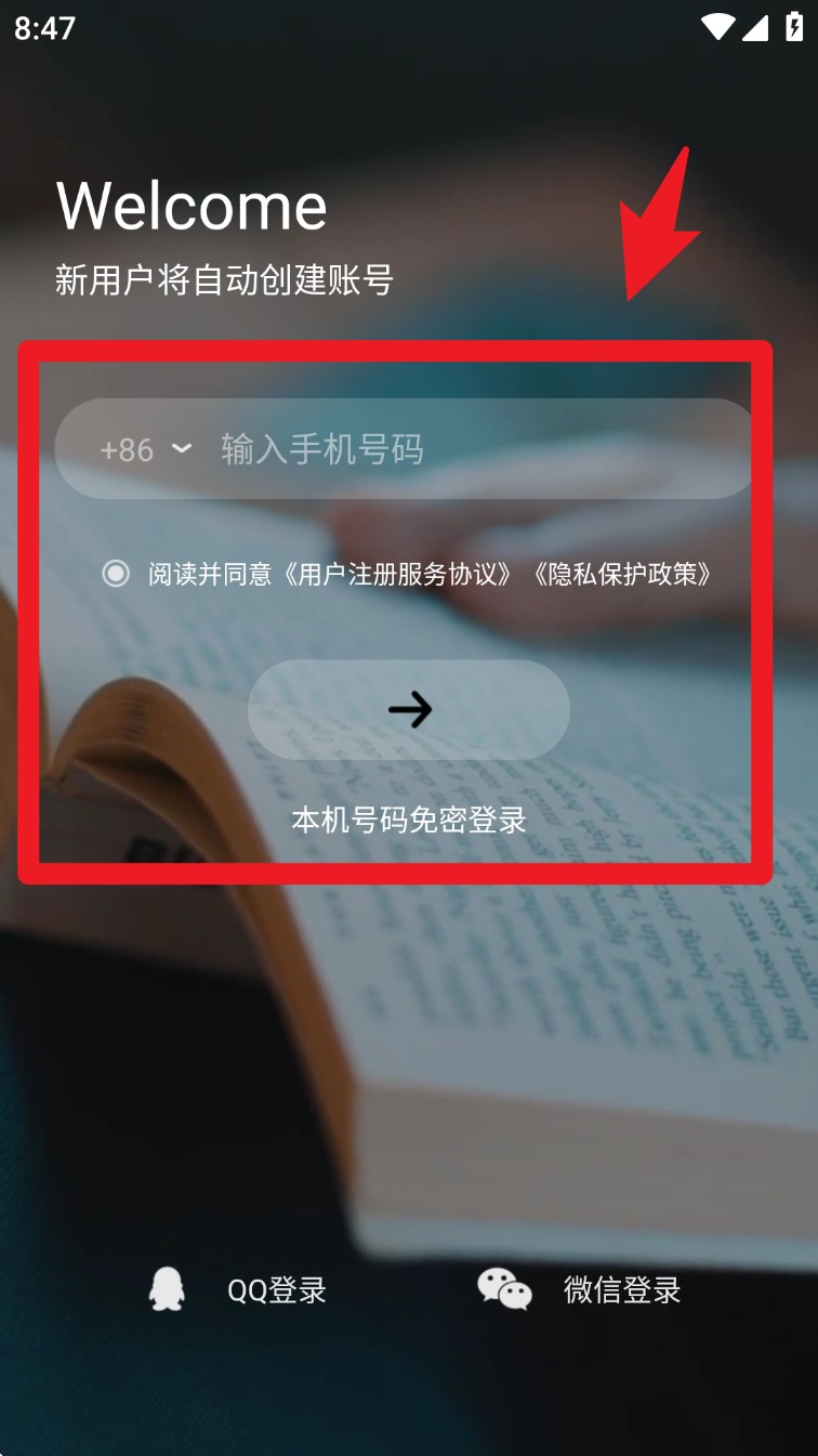 1. 开启App,进入欢迎页面,在此页面输入手机号码,同时勾选用户协议与隐私政策,确认同意后,点击箭头按钮,这样就能完成注册流程,且系统会自动登录。