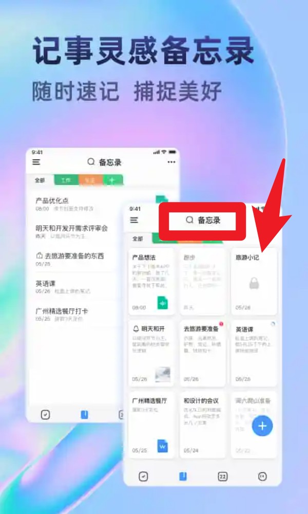 2. 打开首页,点击“备忘录”板块,在这里你能随时添加灵感笔记、临时事项或者生活片段,而且还支持通过关键词搜索,快速找到已有的记录。