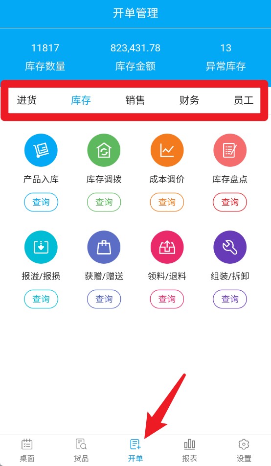3. 进入“开单”页面,即可对库存调整、入库、退料、赠送等各类出入库流程进行操作。
