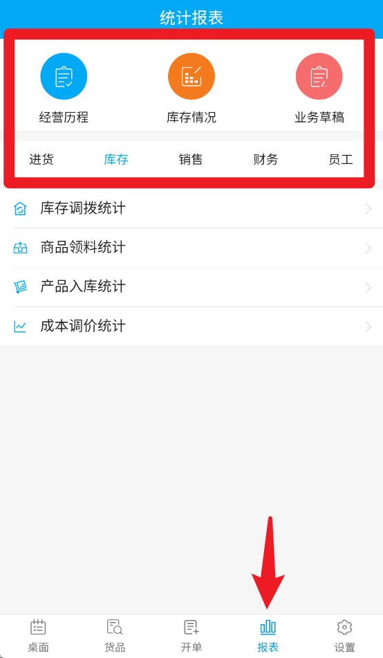 4. 点击“报表”,即可进入统计模块,该模块支持对库存、销售、财务等多个维度的数据进行汇总与分析。
