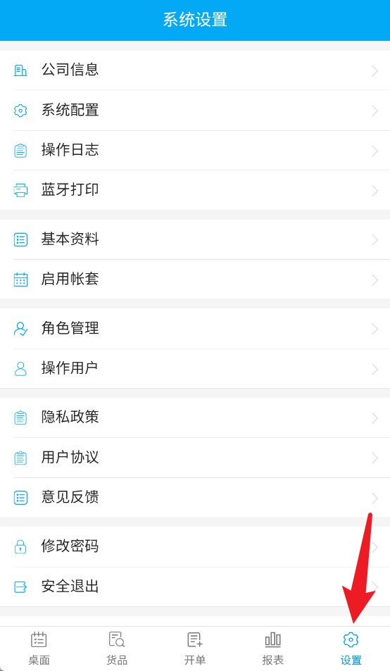 5. 进入“设置”页面,在此页面能够执行系统配置、角色权限设定、蓝牙打印以及账号管理等操作。
