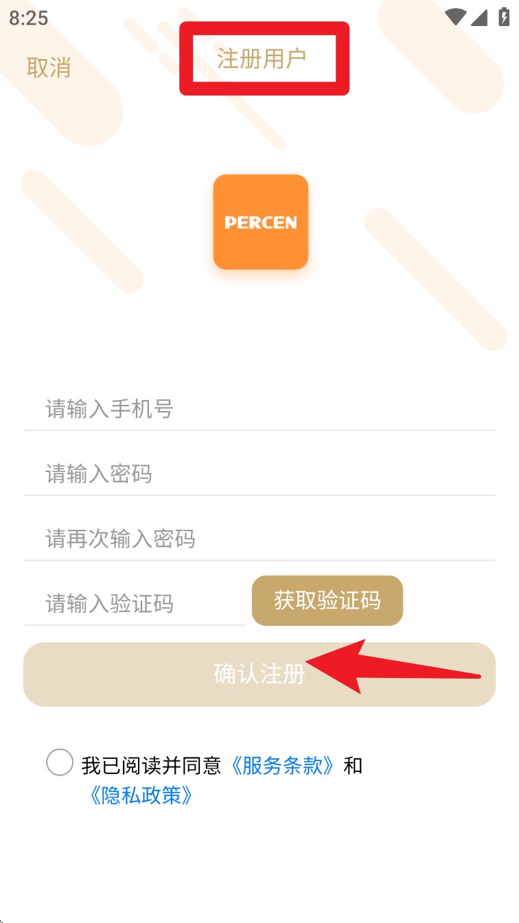1. 开启App,选中「注册用户」选项,填入手机号、密码以及验证码,随后点击「确认注册」。
