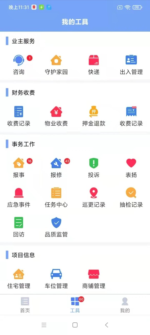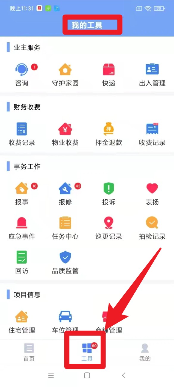 3. 登录之后,点击底部的「工具」选项,进入该界面后,就能快速使用物业收费、报修报事、巡查记录等功能。