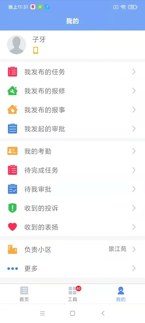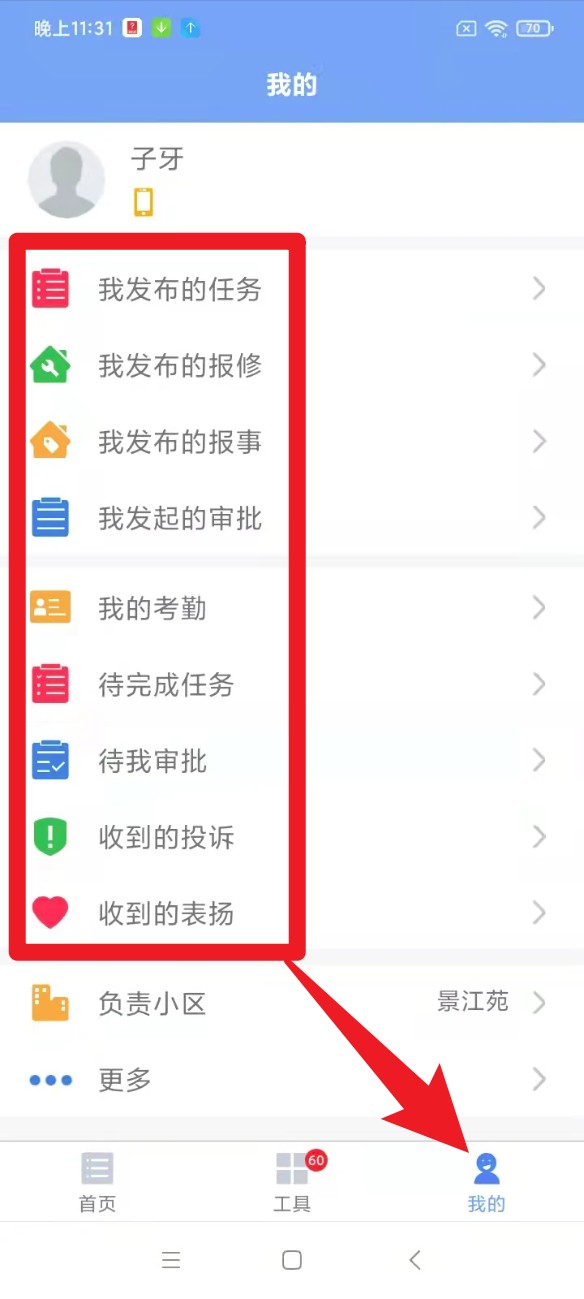 4. 点击底部的「我的」,在这里你可以查看个人任务、投诉与表扬记录,还能够对自己发布的事项以及待审批内容进行管理。