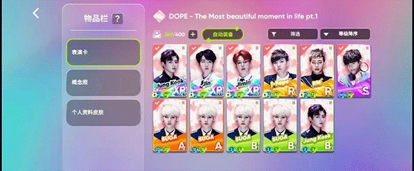 例如,在我这里,Boy With Fun能形成如此阵容,原因在于bang bang con和花1 dope的主题卡都可用于Boy With Fun的演出,然而Suga和V的卡片在花1 dope中的等级低于在bang bang con中的等级。