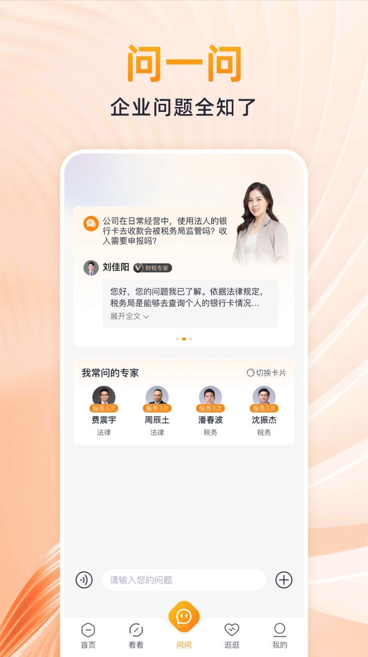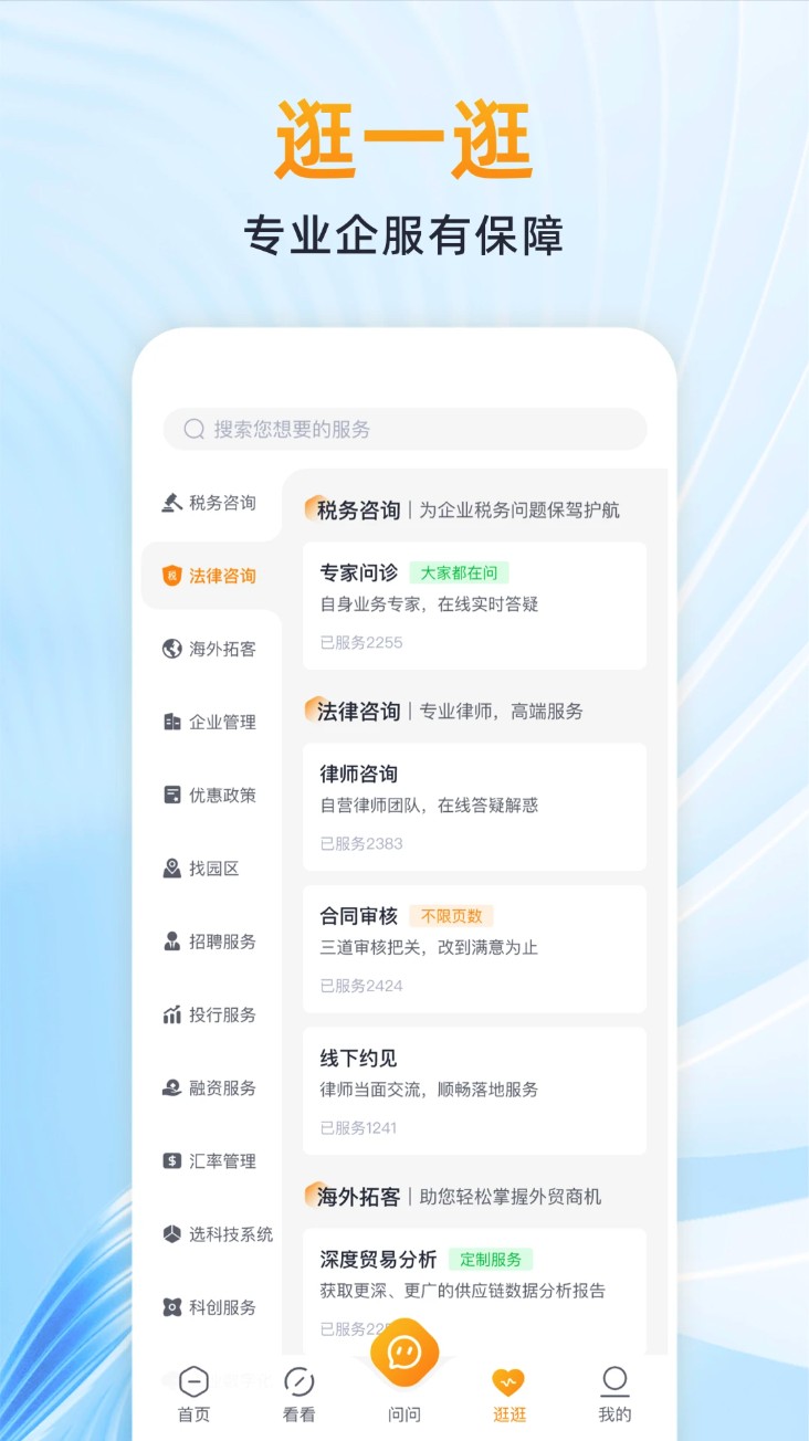 4. 切换到“逛逛”页面,在这里能够浏览法律、税务、海外拓客等众多企业服务内容,这些服务全面覆盖企业经营的各个环节。