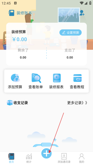 2. 来到首页,点击【+】图标,然后选择【装修记账】。