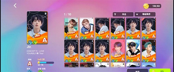 例如,在我这里,Boy With Fun能形成这样的阵容,原因在于bang bang con和花1 dope的主题卡都能用于演出Boy With Fun。然而,Suga和V的卡片在花1 dope中的级别相较于在bang bang con中的级别更低。
