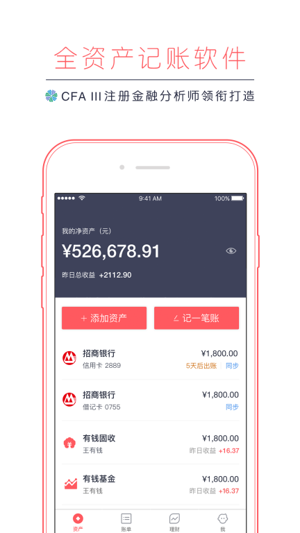 1. 记录你名下银行卡、股票、基金以及互联网理财等各类资产信息,让你能实时掌握资产状态。