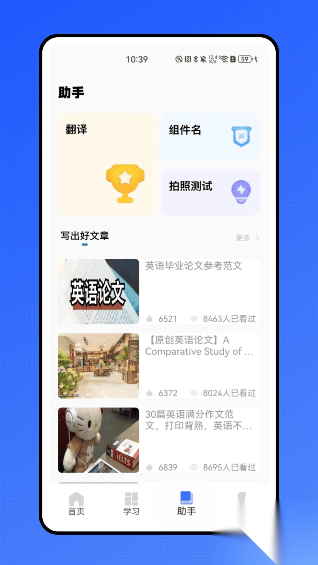 1、助手页面提供多语种翻译功能,支持中英、中日、中韩等多种语言互译,方便考生学习外语和查阅外文资料;