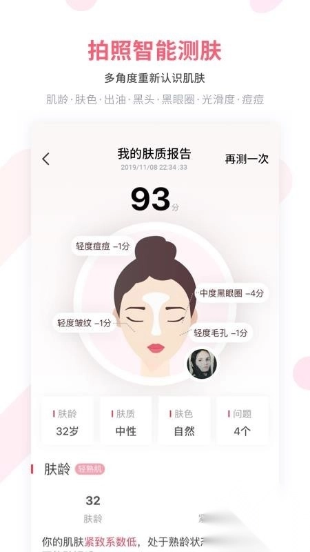 肌肤检测,立即检测皮肤,迅速就能查看到肤质内容;