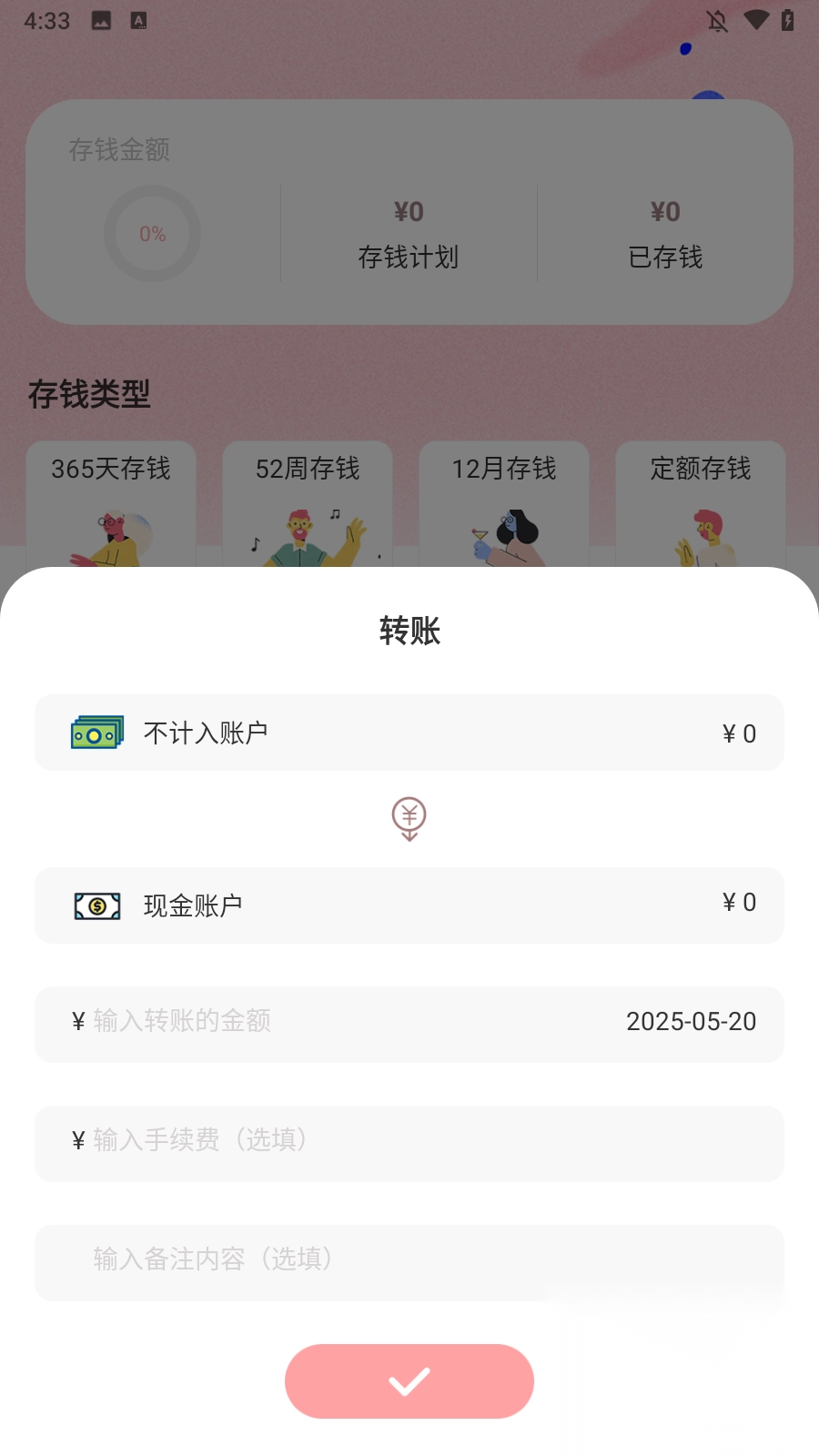 2、点击中间的小猪可以选择存钱、记账或者转账。