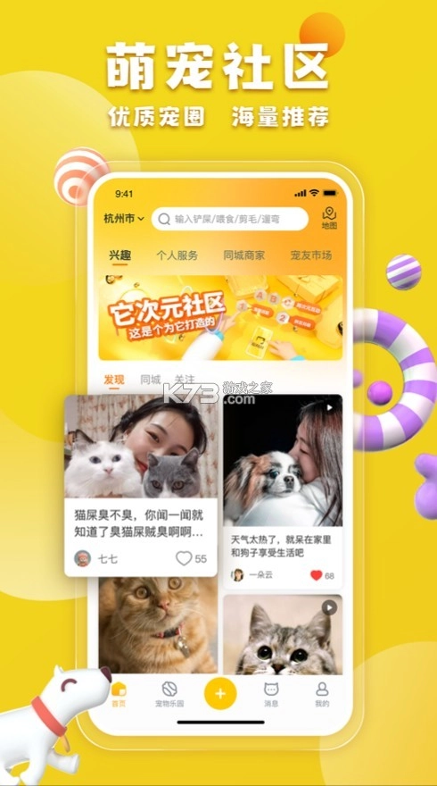 这款软件是一个宠物服务平台,提供宠友互助、借配领养、同城商家、话题小组四个板块,空闲的时候可以多多加入几个话题参与讨论,都是非常有意义的,很多宠物用户都会自动的发起公益行为,为那些流浪宠物提供相应的帮助。打开定位,软件能为你智能推进附近的宠物店,非常方便。软件里面有专业的服务者、优质的商家提供各种养宠服务供宠友挑选;地图模式能够更加直观的向您展示周围的宠友、服务者,地点、距离一目了然,交友互助更便捷。软件还可以满足同城宠物主们上门喂猫、上门遛狗、家庭寄养、借配、领养送养、社交、探店、捡漏等各种需求,轻松便捷解决养宠中遇到的各种问题!宠物家秉承“专注您的宠物生活”的理念,将致力于打造宠物后市场全产业链模式,为中国宠物主提供养宠终身解决方案,让人与宠物和谐共处,让养宠生活更美好。