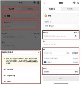 选择需要提币的币种,如BTC,并选择提币方式(链上提现或内部转账)。