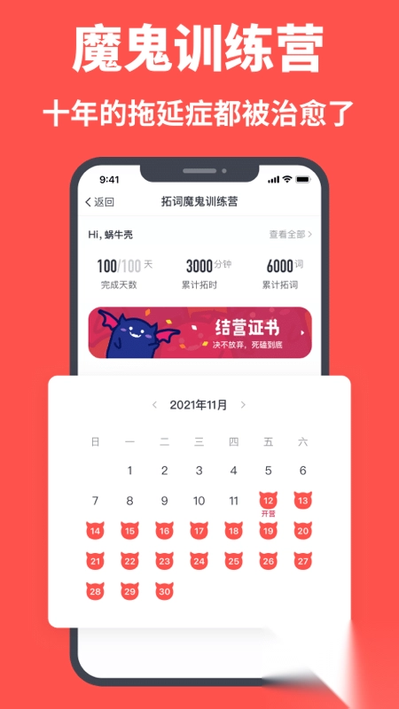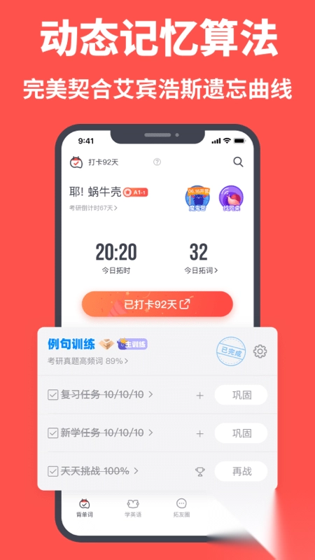 拓词 — 你的专属魔鬼教官,让你单词背得快记得牢,还专注到忘记时间!多到集不齐的勋章,夸夸群出身的拓友,有趣的学习心得,一天不学习就分手的同桌,追命的魔鬼训练营... 在这里背单词学英语,每天都能量满满。