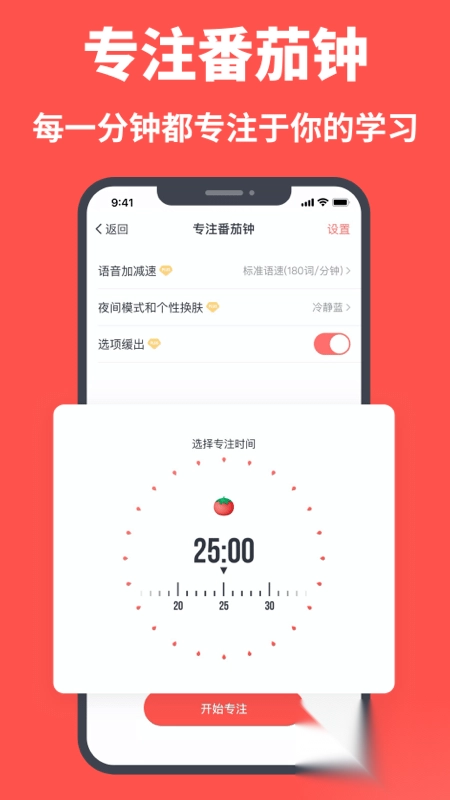 简洁清晰的做答界面,配合着提示音的及时反馈、通过爽快的点击节奏将你带入前所未有的「心流」学习状态。结合「番茄工作法」紧张的倒计时助你全情投入英语学习,专注目标轻松达成,给你前所未有的上瘾背单词体验。
