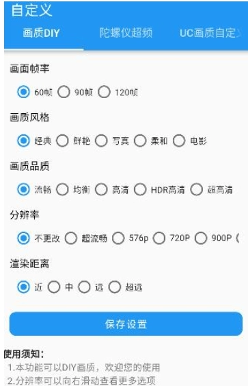 2、点击【自定义】开启自定义选项设置,包括画质DIY、陀螺仪超频、UC画质自定义