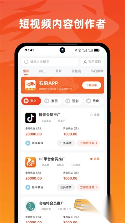 右豹app官网作为专业短剧推广平台,为用户提供全方位推广服务。在右豹应用内,用户能轻松获取短视频素材,随时随地创作短视频,进而获取短剧推广收益,特别适合新手创作者。感兴趣的朋友,赶紧下载体验吧!