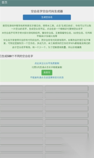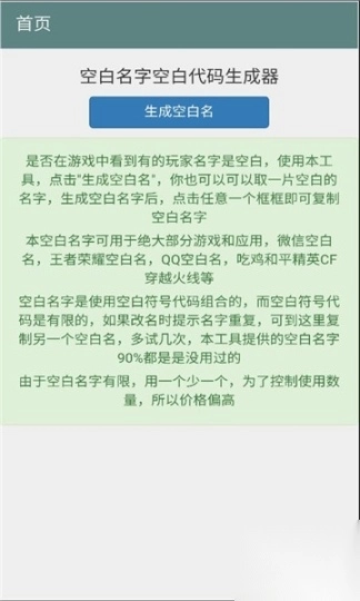 软件空白名字助手安卓版非常实用!它能轻松帮用户获取各种空白名字,操作简单便捷,无论是用于游戏昵称还是社交平台,都能快速满足需求。界面简洁明了,无多余广告干扰,大大提升使用体验,是追求独特空白名字的必备利器。