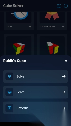 2.以经典的三阶魔方为例,点击三阶魔方,点击【Learn】可以学习三阶魔方的基本还原思路方法,点击【Patterns】可以挑战完成指定样式的魔方,点击【Solve】就是软件最重要的功能,进入为大家提供魔方还原方案的功能。