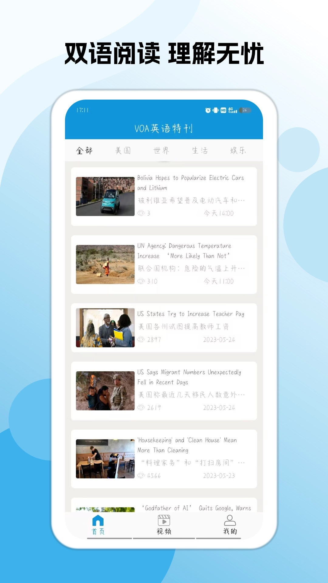 2. App的首页设有“慢速英语”“常速英语”“双语新闻”等板块,用户能够依据自身水平进行选择。