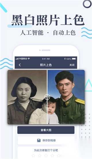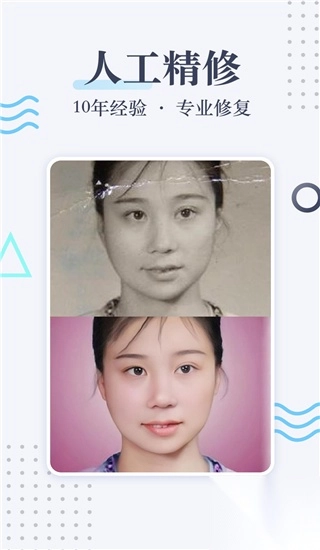 不仅如此,该软件界面简约,操作简便,无需用户掌握专业技术,只需载入图片,一键即可让照片恢复至刚拍摄时的模样。同时,老照片修复软件手机版配备专业的人工精修师,针对破损、划痕、折痕、污点或损坏严重的照片,专业精修师会手工修复,帮助用户保留图片细节,提升清晰度,让照片重焕光彩。
