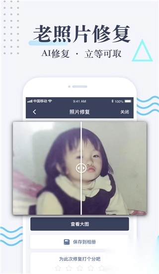 老照片修复免费版APP,堪称一款便捷实用的照片修复利器。这款软件凭借长达10年的专业修复经验,运用智能照片修复模式,能显著增强老相片效果,无论是残破的老照片、模糊不清的照片,还是黑白照片,都能轻松搞定,助力用户轻松还原模糊的老照片,实用性极强。