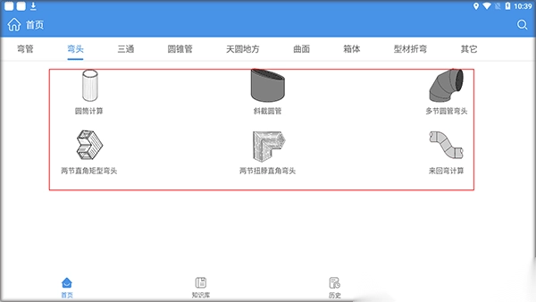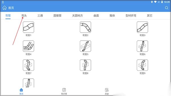 1. 先下载并安装好钣金展开计算器手机版,安装完成后打开软件,接着点击图中所示位置来进行弯头计算。