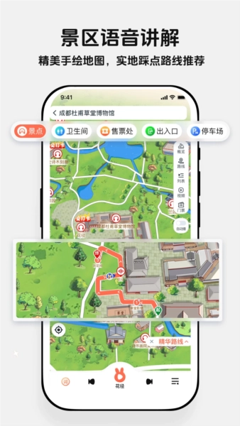 【景区游览】提供景区内最佳游览路线,各小景点的深入语音讲解,精美导览地图。