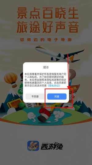 1、打开西游兔app,点击“同意”。