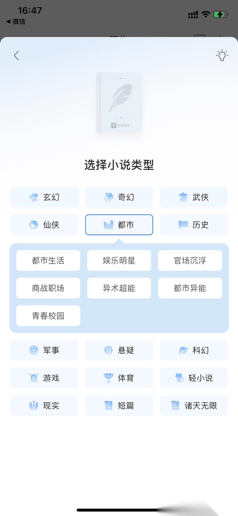即便是同一个小说类型,能选择的细化分类也有很多,如都市类型包括:都市生活、娱乐明星、官场沉浮、商战职场、异术超能、都市异能和青春校园。