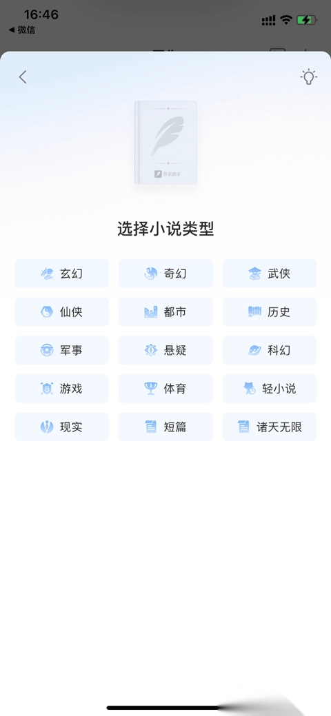 之后挑选小说类型,如玄幻、奇幻、武侠、仙侠、都市、历史、军事、悬疑、科幻、游戏、体育、轻小说以及现实、短篇和诸天无限等等。