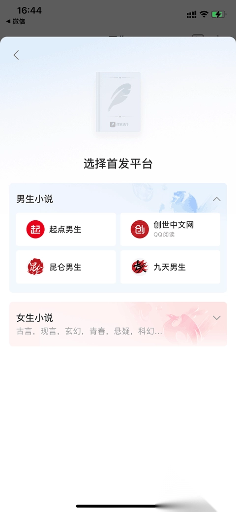 选择首发平台,男生小说可选择的首发平台包括起点男生、创世中文网、昆仑男生和九天男生;女生小说可选择的首发平台平台起点女生、云起书院、红袖添香、潇湘书院、昆仑女生及九天女生等。