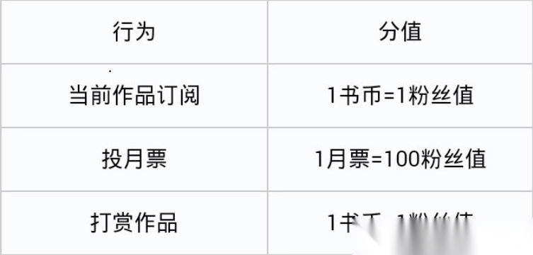 通过当前作品订阅、投月票和打赏作品的行为,可以获得粉丝值,对应的分值兑换情况如图所示