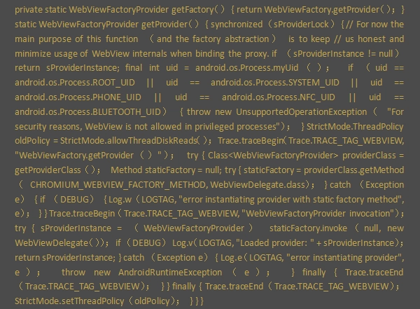 WebViewFactory类的静态成员函数getProvider首先要确定要创建的WebView Factory的类型。这个类型是通过调用另外一个静态成员函数getFactoryClass获得的: