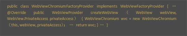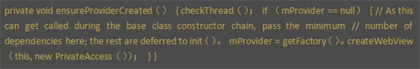 这一步执行完成之后,App进程就加载完成Chromium动态库了。回到前面分析的WebViewFactory类的静态成员函数getProvider,它接下来继续创建一个WebViewFactory。这个WebViewFactory以后就可以用来创建WebViewProvider。