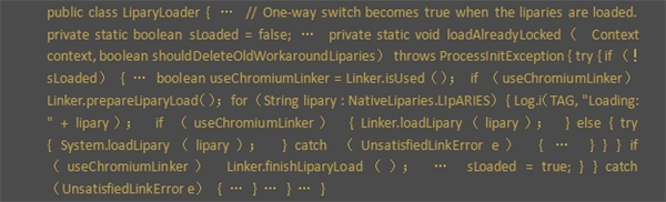 由于并不是所有的系统都支持在加载动态库时,以文件内存映射的方式代替它的GNURELRO Section,因此Chromium自己提供了一个Linker。通过这个Linker加载动态库时,能够以文件内存映射的方式代替要加载的动态库的GNURELRO Section,也就是实现前面提到的函数androiddlopenext的功能。在高于Android 5.0中,由于系统已经提供了函数androiddlopenext,因此,Chromium就不会使用自己的Linker加载动态库,而是使用Android系统提供的Linker来加载动态库。通过调用System类的静态成员函数loadLipary即可以使用系统提供的Linker来加载动态库。LiparyLoader类的静态成员函数loadAlreadyLocked要加载的动态库由NativeLiparies类的静态成员变量LIpARIES指定: