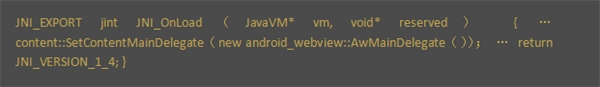 从这里可以知道,LiparyLoader类的静态成员函数loadAlreadyLocked要加载的动态库就是Chromium动态库。这个Chromium动态库前面已经加载过了,因此这里通过调用System类的静态成员函数loadLipary再加载时,仅仅是只会触发它导出的函数JNIOnLoad被调用,而不会重新被加载。Chromium动态库导出的JNIOnLoad被调用的时候,Chromium动态库就会执行初始化工作: