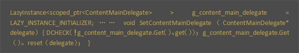其中的一个初始化操作是给Chromium的Content层设置一个类型为AwMainDelegate的Main Delegate。这个AwMainDelegate实现在Chromium的androidwebview模块中。Android WebView是通过Chromium的androidwebview模块加载和渲染网页的。Chromium加载和渲染网页的功能又是实现在Content层的,因此,Chromium的androidwebview模块又要通过Content层实现加载和渲染网页功能。这样,Chromium的androidwebview模块就可以设置一个Main Delegate给Content层,以便它们可以互相通信。给Chromium的Content层设置一个Main Delegate是通过调用函数SetContentMainDelegate实现的: