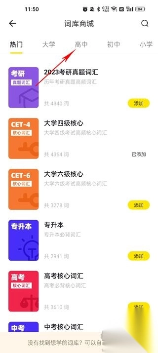 2、进入词库页面,点击添加词库,选择自己需要的词库添加;