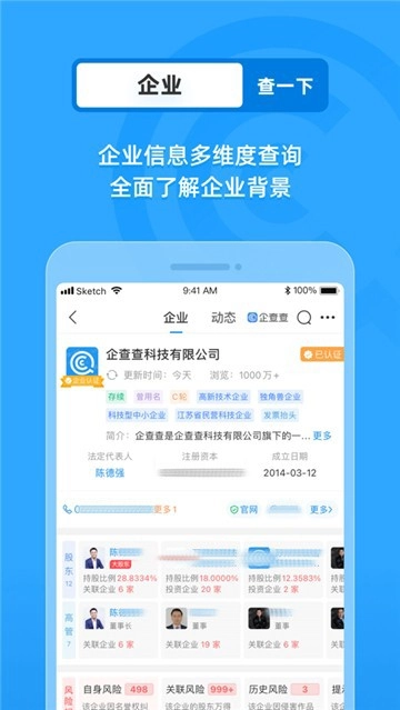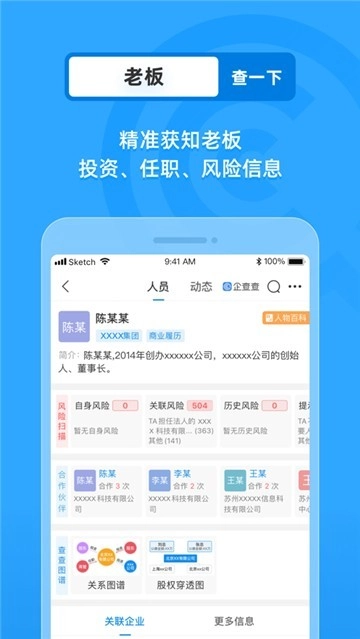 一键查询目标人物关系网,轻松获取你想知道的公司信息,更有百余种数据维度任你使用。 关系梳理清晰透明,专业信用报告呈现等一系列高阶功能,深受明星与企业老板青睐。 企查查,实时洞察商业资讯,是成功人士都在使用的信息查询利器。