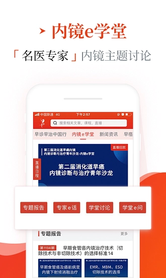 早诊早治app聚焦于癌症早筛以及内镜技术教育!整合了早诊早治中国行资讯、专家直播、内镜手术视频、远程教学等多样化内容,用户还可参与内镜e学堂专题分享,成体系地学习规范化课程,并记录自身成长历程~是内镜医生提升专业技能、交流实践经验的不二之选平台!