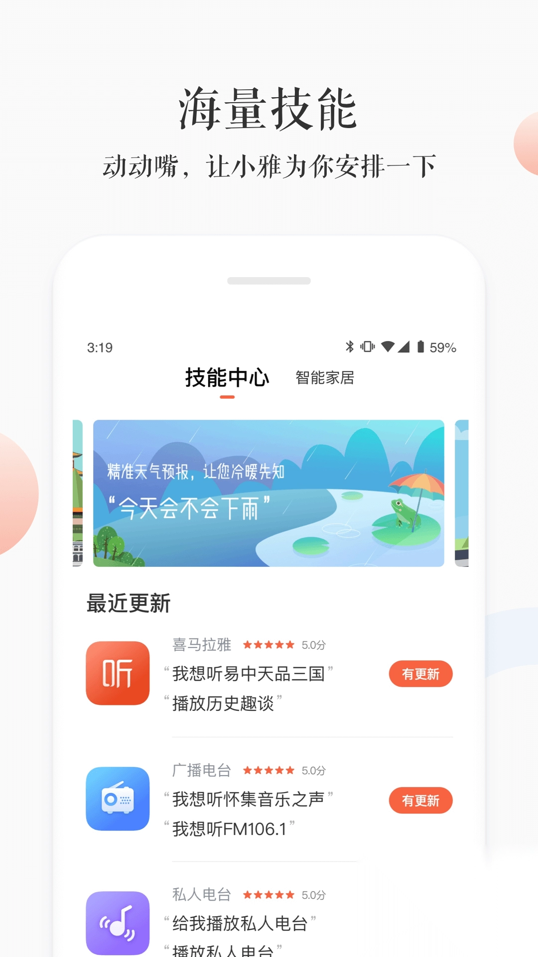 2、海量技能,支持语音多样,动动嘴,让小雅为你安排一下;