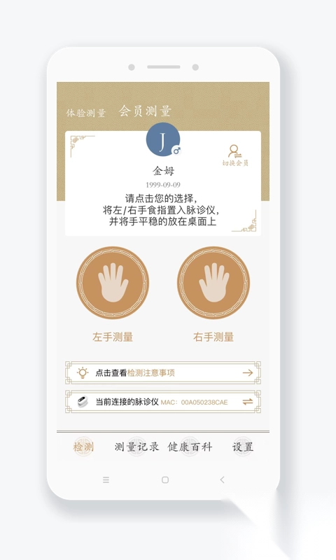 使用金姆脉诊仪时,男士将其夹在左手食指,女士夹在右手食指。随后,双手需平放在桌面上,双脚也平放,保持舒适且平稳的坐姿。整个测量过程约两分钟,在测量期间,请务必保持安静,不要说话,也不要随意乱动。