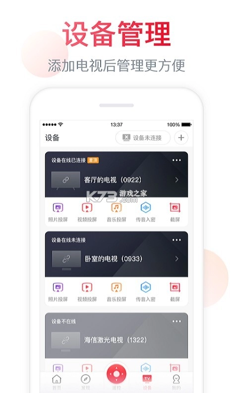 2. 在海信电视遥控器手机版中,挑选您想要投屏的电视或盒子,连接成功后,即可开展投屏、视频推送等相关操作。